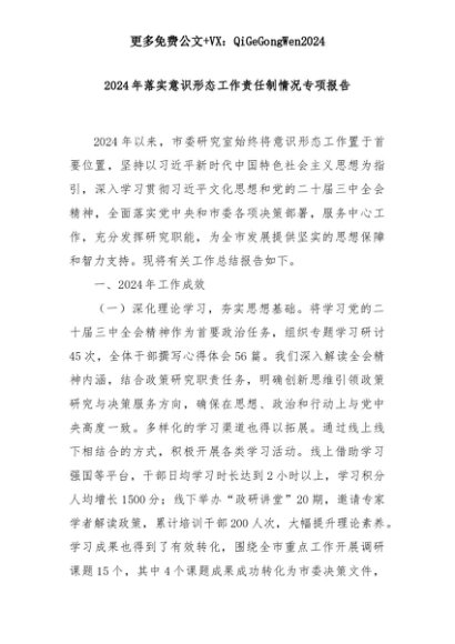 【七哥公文】2025年:2024年落实意识形态工作责任制情况专项报告+更多免费公文+VX:QiGeGongWen2024+更多免费公文+VX:QiGeGongWen2024