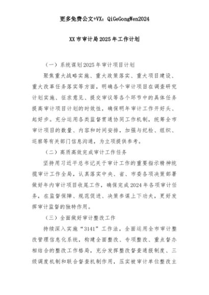 【七哥公文】2025年:XX市审计局2025年工作计划+更多免费公文+VX:QiGeGongWen2024+更多免费公文+VX:QiGeGongWen2024