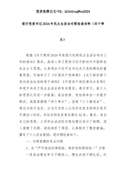 【七哥公文】2025年:银行党委书记2024年民主生活会对照检查材料(四个带头)+更多免费公文+VX:QiGeGongWen2024+更多免费公文+VX:QiGeGongWen2024