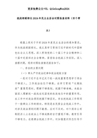 【七哥公文】2025年:统战部副部长2024年民主生活会对照检查材料(四个带头)+更多免费公文+VX:QiGeGongWen2024+更多免费公文+VX:QiGeGongWen2024