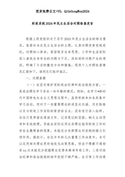 【七哥公文】2025年:财政系统2024年民主生活会对照检查发言+更多免费公文+VX:QiGeGongWen2024+更多免费公文+VX:QiGeGongWen2024