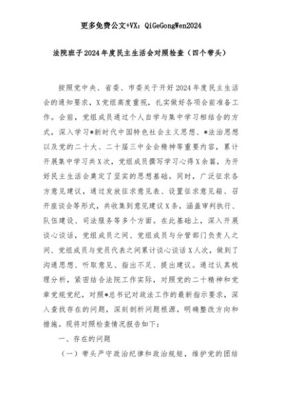 【七哥公文】2025年:法院班子2024年度民主生活会对照检查(四个带头)+更多免费公文+VX:QiGeGongWen2024+更多免费公文+VX:QiGeGongWen2024