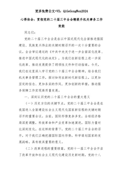 【七哥公文】2025年:心得体会:贯彻党的二十届三中全会精提升机关事务工作效能+更多免费公文+VX:QiGeGongWen2024+更多免费公文+VX:QiGeGongWen2024
