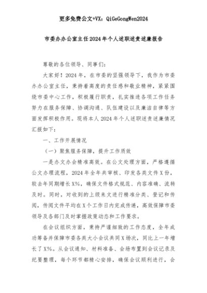 【七哥公文】2025年:市委办办公室主任2024年个人述职述责述廉报告+更多免费公文+VX:QiGeGongWen2024+更多免费公文+VX:QiGeGongWen2024