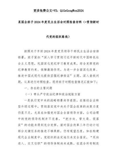 【七哥公文】2025年:某国企班子2024年度民主生活会对照检查材料(+贯彻新时代党的组织路线)+更多免费公文+VX:QiGeGongWen2024+更多免费公文+VX:QiGeGongWen2024
