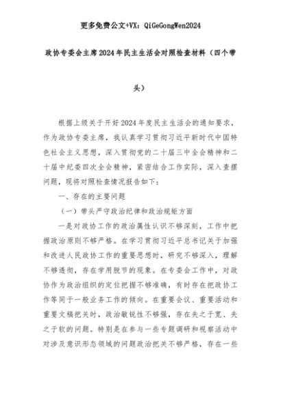 【七哥公文】2025年:政协专委会主席2024年民主生活会对照检查材料(四个带头)+更多免费公文+VX:QiGeGongWen2024+更多免费公文+VX:QiGeGongWen2024