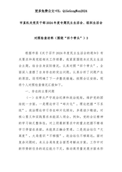 【七哥公文】2025年:市直机关党员干部2024年度专题民主生活会、组织生活会对照检查材料(围绕“四个带头”)3+更多免费公文+VX:QiGeGongWen2024+更多免费公文+VX:QiGeGongWen2024