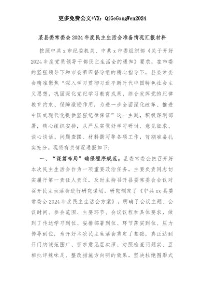 【七哥公文】2025年:某县委常委会2024年度民主生活会准备情况汇报材料+更多免费公文+VX:QiGeGongWen2024+更多免费公文+VX:QiGeGongWen2024