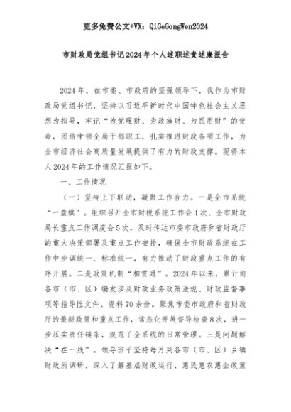 【七哥公文】2025年:市财政局党组书记2024年个人述职述责述廉报告+更多免费公文+VX:QiGeGongWen2024+更多免费公文+VX:QiGeGongWen2024