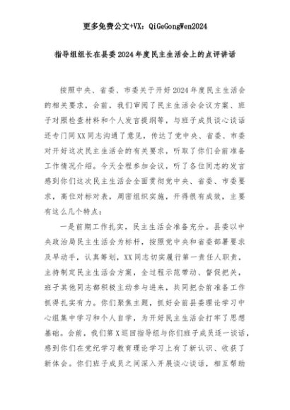 【七哥公文】2025年:指导组组长在县委2024年度民主生活会上的点评讲话+更多免费公文+VX:QiGeGongWen2024+更多免费公文+VX:QiGeGongWen2024