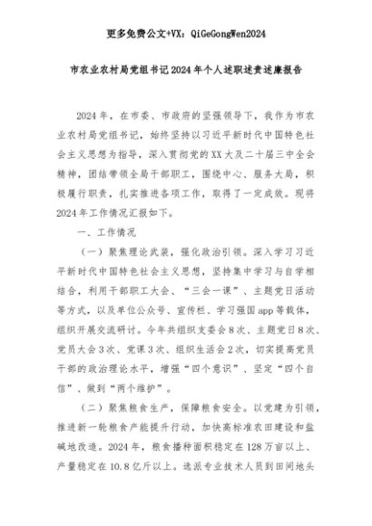 【七哥公文】2025年:市农业农村局党组书记2024年个人述职述责述廉报告+更多免费公文+VX:QiGeGongWen2024+更多免费公文+VX:QiGeGongWen2024