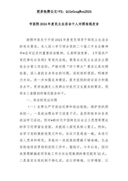 【七哥公文】2025年:市医院2024年度民主生活会个人对照检视发言+更多免费公文+VX:QiGeGongWen2024+更多免费公文+VX:QiGeGongWen2024