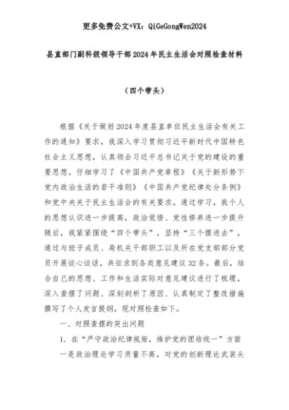 【七哥公文】2025年:县直部门副科级领导干部2024年民主生活会对照检查材料(四个带头)+更多免费公文+VX:QiGeGongWen2024+更多免费公文+VX:QiGeGongWen2024