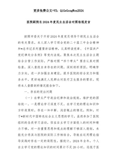 【七哥公文】2025年:医院副院长2024年度民主生活会对照检视发言+更多免费公文+VX:QiGeGongWen2024+更多免费公文+VX:QiGeGongWen2024