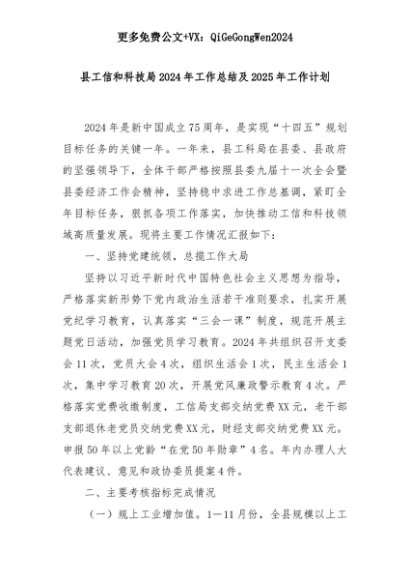 【七哥公文】2025年:县工信和科技局2024年工作总结及2025年工作计划+更多免费公文+VX:QiGeGongWen2024+更多免费公文+VX:QiGeGongWen2024