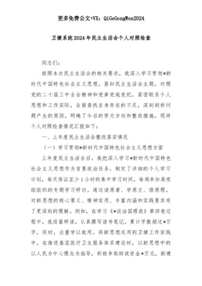 【七哥公文】2025年:卫健系统2024年民主生活会个人对照检查+更多免费公文+VX:QiGeGongWen2024+更多免费公文+VX:QiGeGongWen2024