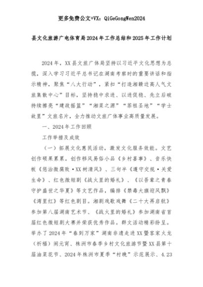 【七哥公文】2025年:县文化旅游广电体育局2024年工作总结和2025年工作计划+更多免费公文+VX:QiGeGongWen2024+更多免费公文+VX:QiGeGongWen2024