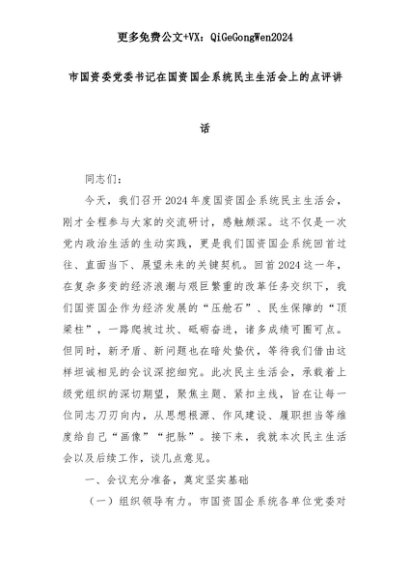 【七哥公文】2025年:市国资委党委书记在国资国企系统民主生活会上的点评讲话+更多免费公文+VX:QiGeGongWen2024+更多免费公文+VX:QiGeGongWen2024