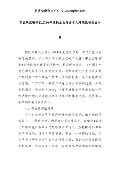 【七哥公文】2025年:市医院纪委书记2024年度民主生活会个人对照检视发言材料+更多免费公文+VX:QiGeGongWen2024+更多免费公文+VX:QiGeGongWen2024
