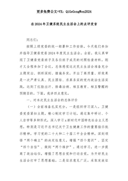 【七哥公文】2025年:在2024年卫健系统民主生活会上的点评发言+更多免费公文+VX:QiGeGongWen2024+更多免费公文+VX:QiGeGongWen2024