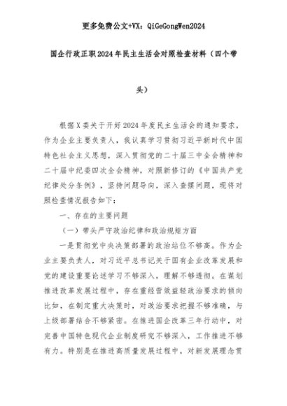 【七哥公文】2025年:国企行政正职2024年民主生活会对照检查材料(四个带头)+更多免费公文+VX:QiGeGongWen2024+更多免费公文+VX:QiGeGongWen2024