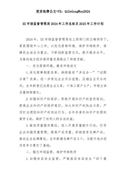 【七哥公文】2025年:XX市场监督管理局2024年工作总结及2025年工作计划+更多免费公文+VX:QiGeGongWen2024+更多免费公文+VX:QiGeGongWen2024