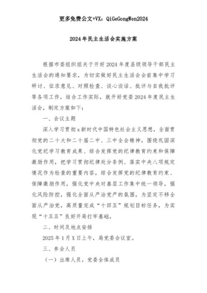 【七哥公文】2025年:2024年民主生活会实施方案+更多免费公文+VX:QiGeGongWen2024+更多免费公文+VX:QiGeGongWen2024
