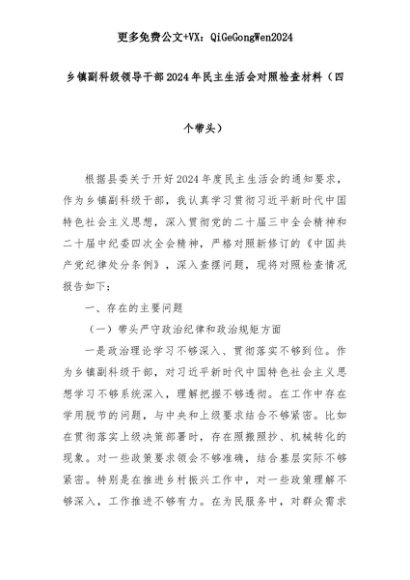 【七哥公文】2025年:乡镇副科级领导干部2024年民主生活会对照检查材料(四个带头)+更多免费公文+VX:QiGeGongWen2024+更多免费公文+VX:QiGeGongWen2024