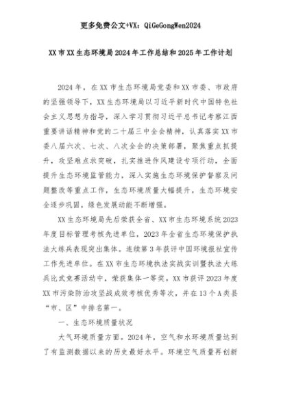【七哥公文】2025年:XX市XX生态环境局2024年工作总结和2025年工作计划+更多免费公文+VX:QiGeGongWen2024+更多免费公文+VX:QiGeGongWen2024