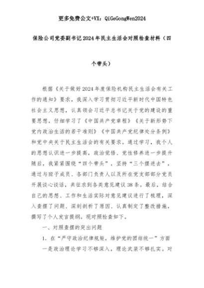 【七哥公文】2025年:保险公司党委副书记2024年民主生活会对照检查材料(四个带头)+更多免费公文+VX:QiGeGongWen2024+更多免费公文+VX:QiGeGongWen2024