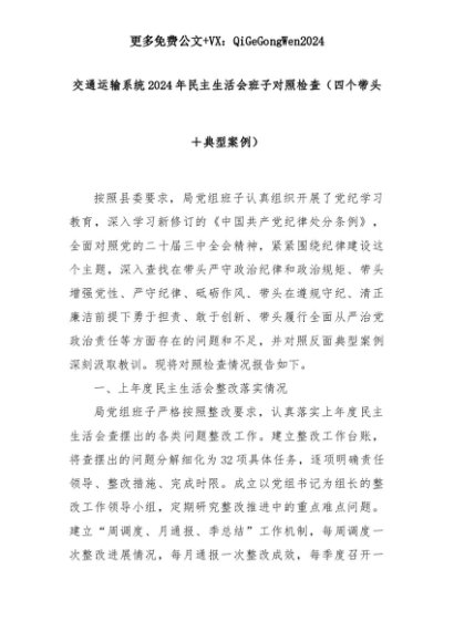 【七哥公文】2025年:交通运输系统2024年民主生活会班子对照检查(四个带头+典型案例)+更多免费公文+VX:QiGeGongWen2024+更多免费公文+VX:QiGeGongWen2024