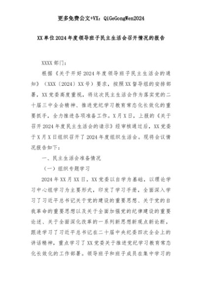【七哥公文】2025年:XX单位2024年度领导班子民主生活会召开情况的报告+更多免费公文+VX:QiGeGongWen2024+更多免费公文+VX:QiGeGongWen2024