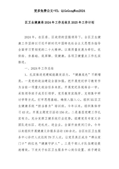 【七哥公文】2025年:区卫生健康局2024年工作总结及2025年工作计划+更多免费公文+VX:QiGeGongWen2024+更多免费公文+VX:QiGeGongWen2024