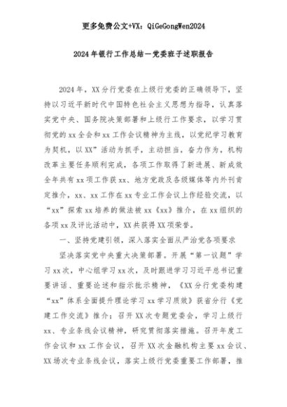 【七哥公文】2025年:2024年银行工作总结-党委班子述职报告+更多免费公文+VX:QiGeGongWen2024+更多免费公文+VX:QiGeGongWen2024