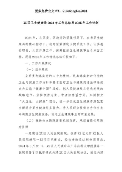 【七哥公文】2025年:XX区卫生健康局2024年工作总结及2025年工作计划+更多免费公文+VX:QiGeGongWen2024+更多免费公文+VX:QiGeGongWen2024