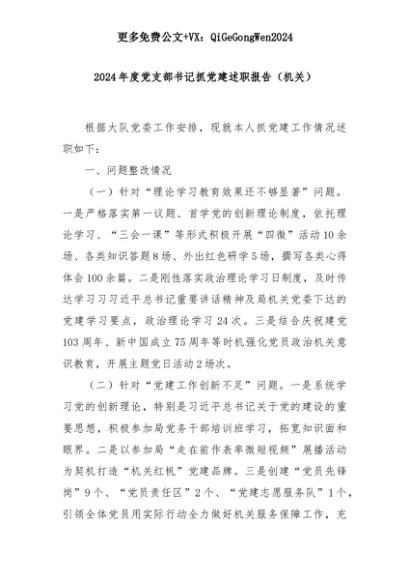 【七哥公文】2025年:2024年度党支部书记抓党建述职报告(机关)+更多免费公文+VX:QiGeGongWen2024+更多免费公文+VX:QiGeGongWen2024