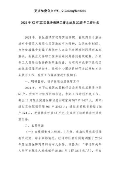 【七哥公文】2025年:2024年XX市XX区住房保障工作总结及2025年工作计划+更多免费公文+VX:QiGeGongWen2024+更多免费公文+VX:QiGeGongWen2024