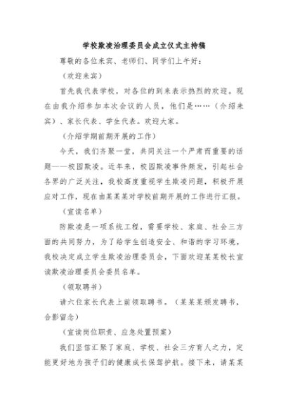 【七哥公文】2025年:学校欺凌治理委员会成立仪式主持稿+更多免费公文+VX:QiGeGongWen2024