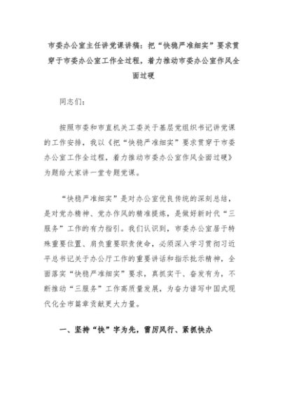 【七哥公文】2025年:市委办公室主任讲党课讲稿:把“快稳严准细实”要求贯穿于市委办公室工作全过程,着力推动市委办公室作风全面过硬+更多免费公文+VX:QiGeGongWen2024