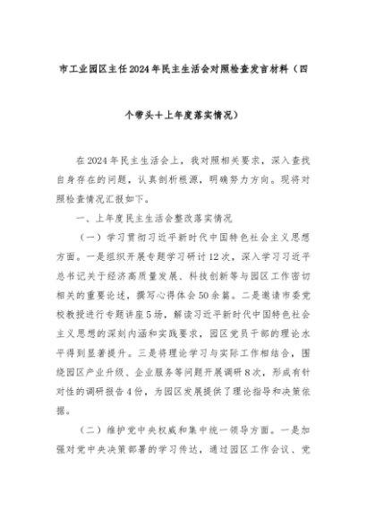 【七哥公文】2025年:市工业园区主任2024年民主生活会对照检查发言材料(四个带头+上年度落实情况)+更多免费公文+VX:QiGeGongWen2024