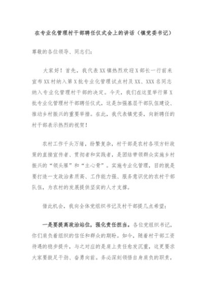 【七哥公文】2025年:在专业化管理村干部聘任仪式会上的讲话(镇党委书记)+更多免费公文+VX:QiGeGongWen2024
