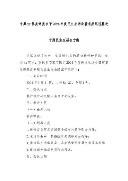 【七哥公文】2025年:中共xx县委常委班子2024年度民主生活会暨省委巡视整改专题民主生活会方案+更多免费公文+VX:QiGeGongWen2024