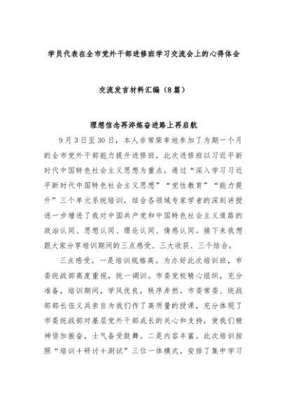 【七哥公文】2025年:(8篇)学员代表在全市党外干部进修班学习交流会上的心得体会交流发言材料汇编+更多免费公文+VX:QiGeGongWen2024