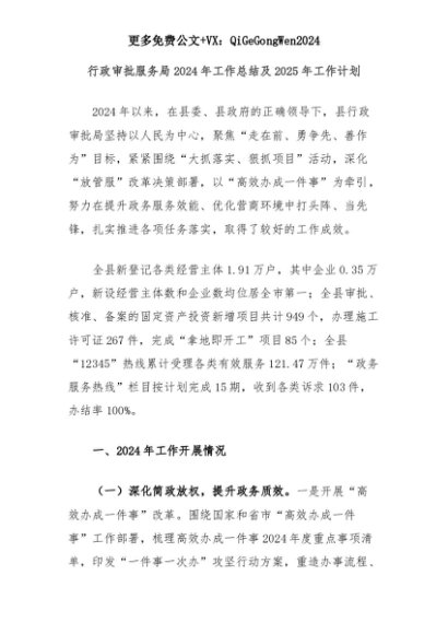 【七哥公文】2025年:行政审批服务局2024年工作总结及2025年工作计划+更多免费公文+VX:QiGeGongWen2024+更多免费公文+VX:QiGeGongWen2024