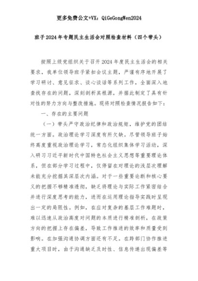 【七哥公文】2025年:班子2024年专题民主生活会对照检查材料(四个带头)+更多免费公文+VX:QiGeGongWen2024+更多免费公文+VX:QiGeGongWen2024