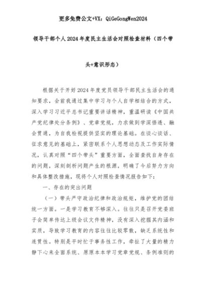 【七哥公文】2025年:领导干部个人2024年度民主生活会对照检查材料(四个带头+意识形态)+更多免费公文+VX:QiGeGongWen2024+更多免费公文+VX:QiGeGongWen2024