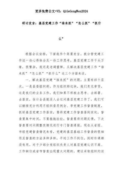 【七哥公文】2025年:研讨发言:基层党建工作“谁来抓”“怎么抓”“抓什么”+更多免费公文+VX:QiGeGongWen2024+更多免费公文+VX:QiGeGongWen2024