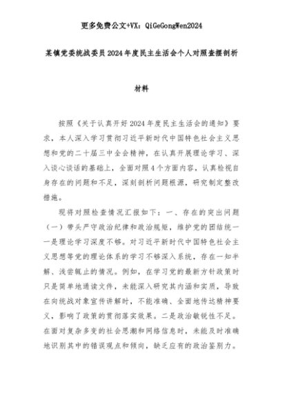 【七哥公文】2025年:某镇党委统战委员 2024 年度民主生活会个人对照查摆剖析材料+更多免费公文+VX:QiGeGongWen2024+更多免费公文+VX:QiGeGongWen2024
