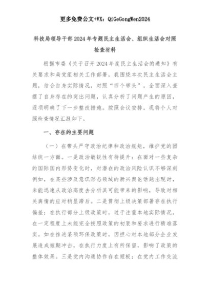 【七哥公文】2025年:科技局领导干部2024年专题民主生活会、组织生活会对照检查材料+更多免费公文+VX:QiGeGongWen2024+更多免费公文+VX:QiGeGongWen2024