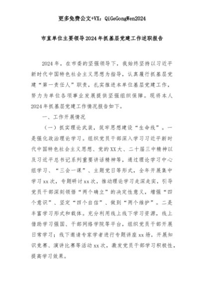【七哥公文】2025年:市直单位主要领导2024年抓基层党建工作述职报告+更多免费公文+VX:QiGeGongWen2024+更多免费公文+VX:QiGeGongWen2024